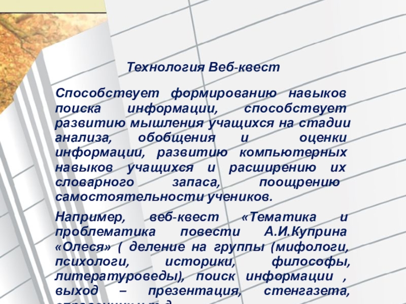 Например, веб-квест «Тематика и проблематика повести А.И.Куприна «Олеся» ( деление на группы (мифологи, психологи, историки, философы,литературоведы), поиск информации , выход – презентация, стенгазета,справочник и т.д.