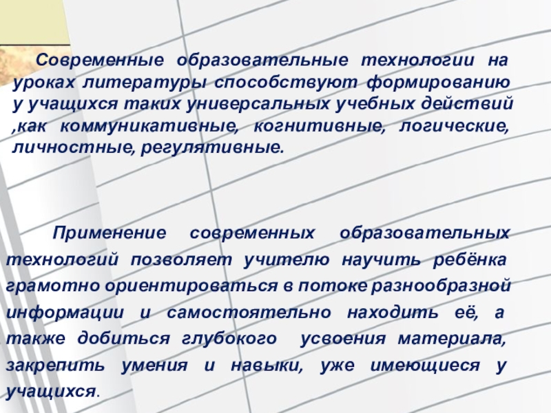 Слайд 3 Современные образовательные технологии на уроках литературы способствуют формированию у учащихся