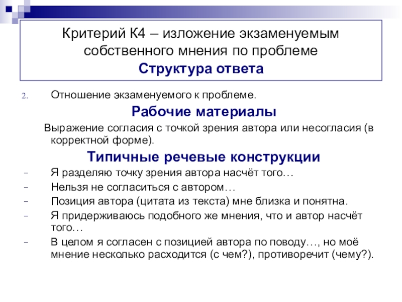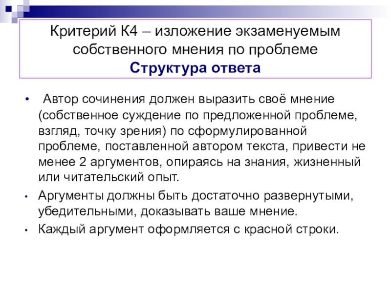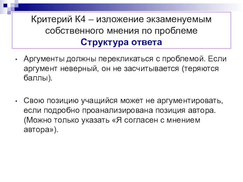 Слайд 26Критерий К4 – изложение экзаменуемым собственного мнения по проблеме