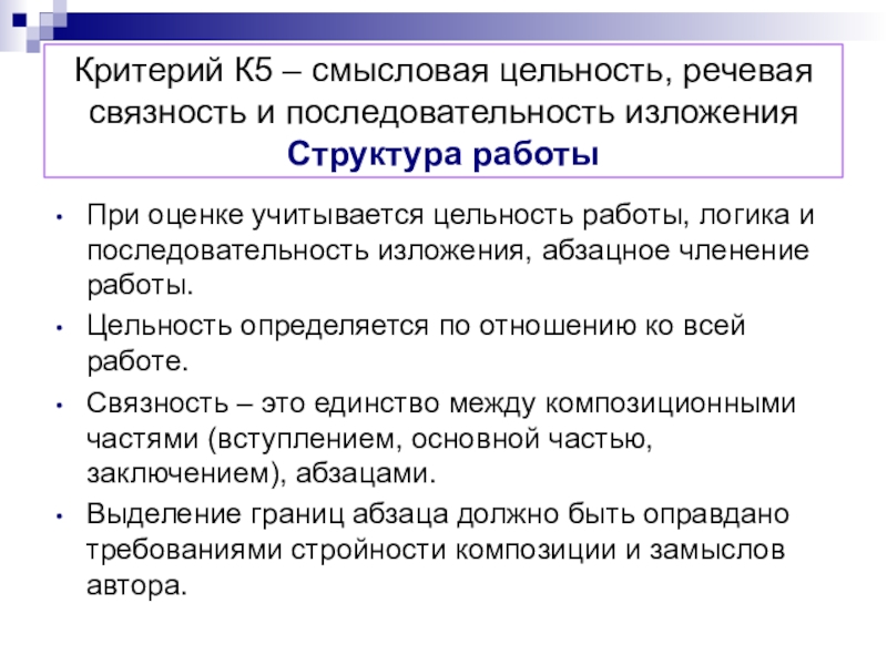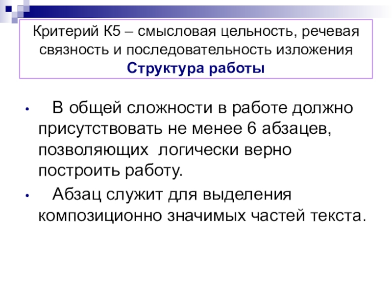 Слайд 30Критерий К5 – смысловая цельность, речевая связность и последовательность изложения.