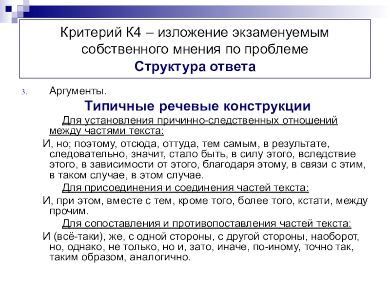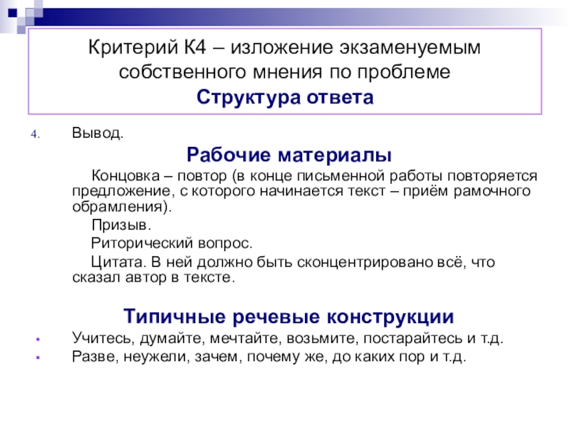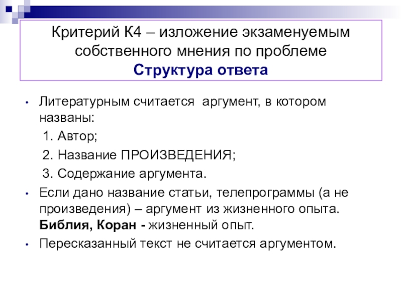 Слайд 24Критерий К4 – изложение экзаменуемым собственного мнения по проблеме