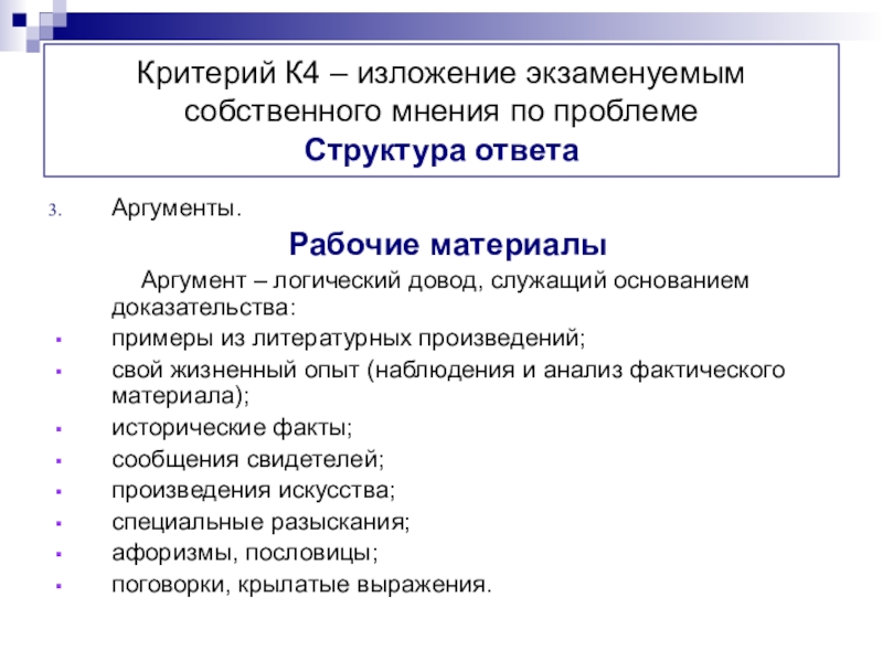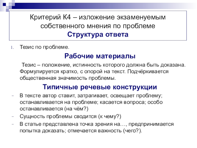 Слайд 25Критерий К4 – изложение экзаменуемым собственного мнения по проблеме