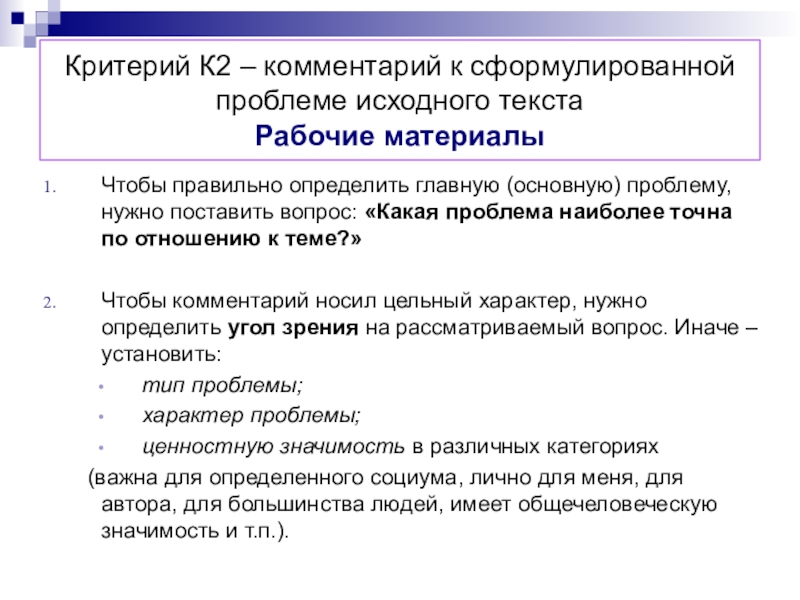 Слайд 10Критерий К2 – комментарий к сформулированной проблеме исходного текста