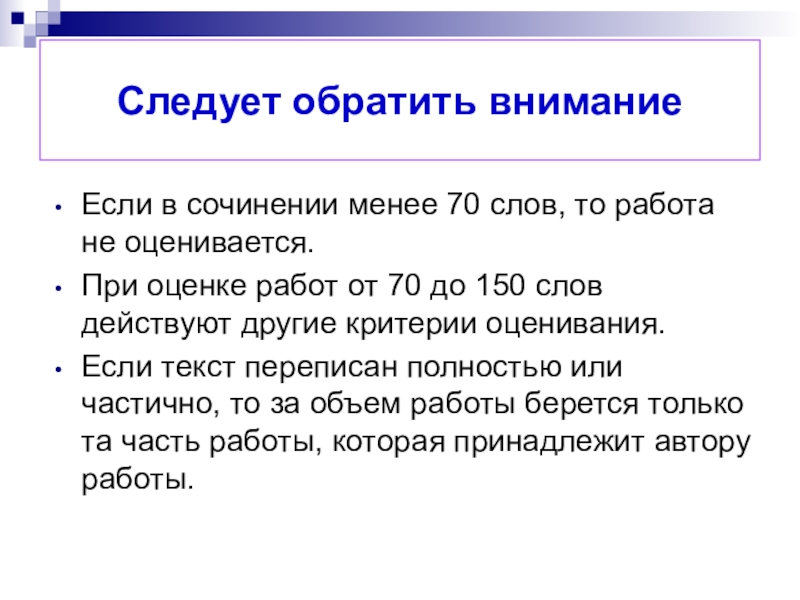 При оценке работ от 70 до 150 слов действуют другие критерии оценивания.