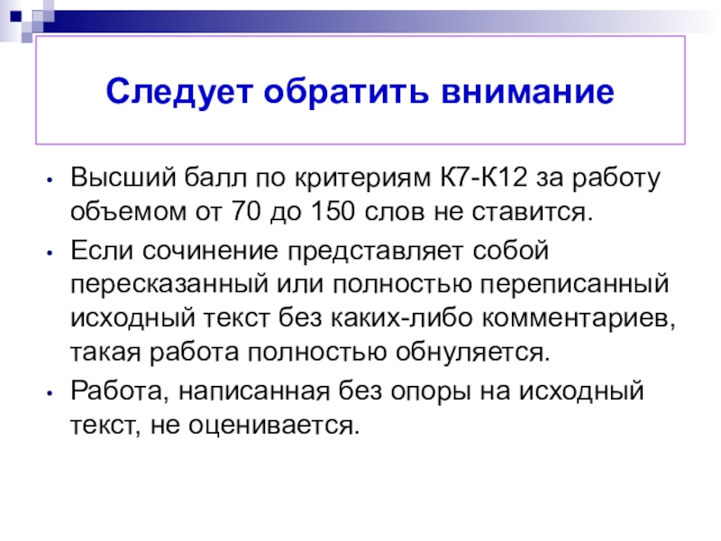 Если сочинение представляет собой пересказанный или полностью переписанный исходный текст без каких-либо комментариев, такая работа полностью обнуляется.