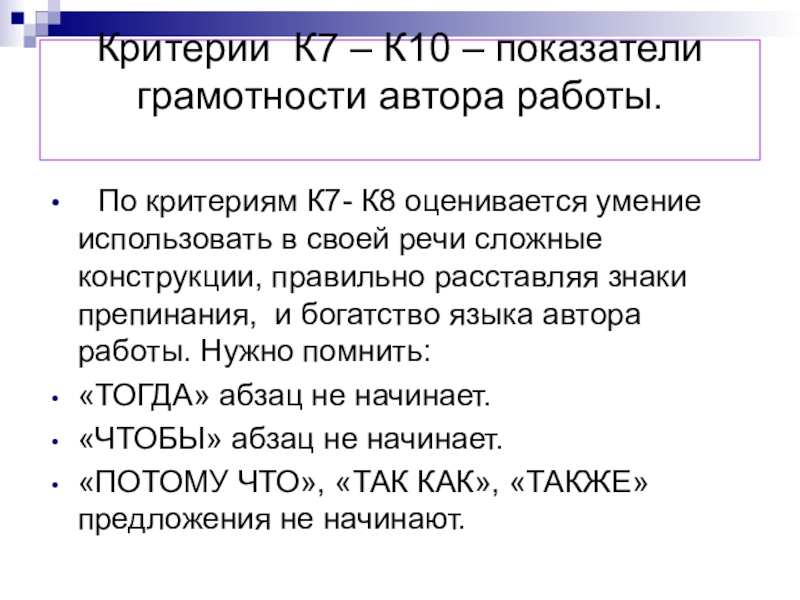 К7- К8 оценивается умение использовать в своей речи сложные конструкции, правильно расставляя знаки препинания, и богатство языка автора работы. Нужно помнить: