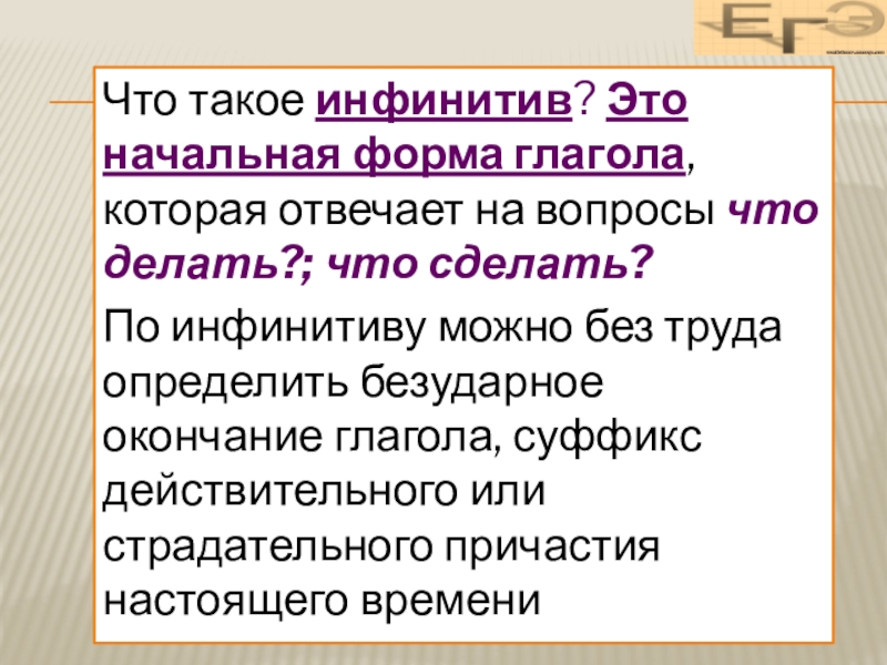 Слайд 6Что такое инфинитив? Это начальная форма глагола, которая отвечает на вопросы