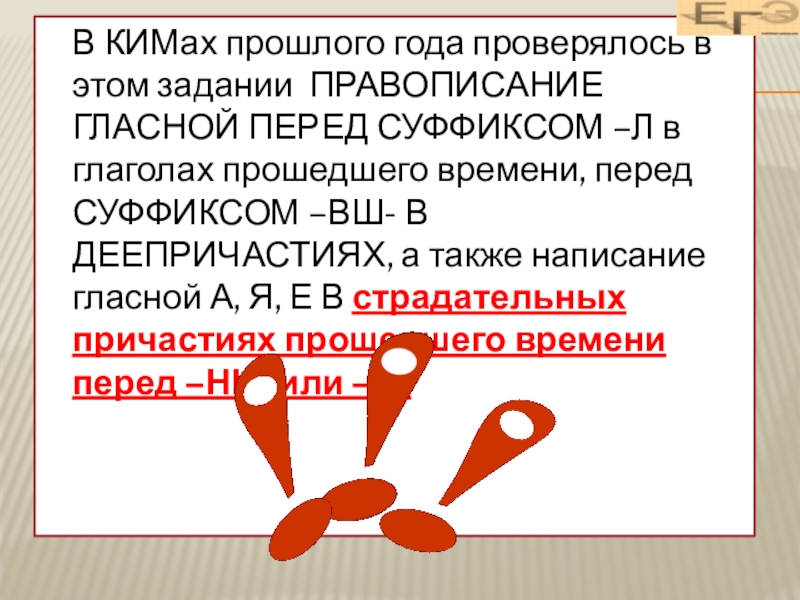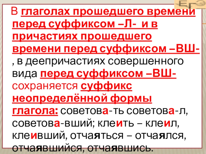 ГЛАСНОЙ ПЕРЕД СУФФИКСОМ –Л в глаголах прошедшего времени, перед СУФФИКСОМ –ВШ- В ДЕЕПРИЧАСТИЯХ, а также написание гласной А, Я, Е В страдательных причастиях прошедшего времени перед –НН- или –Н-