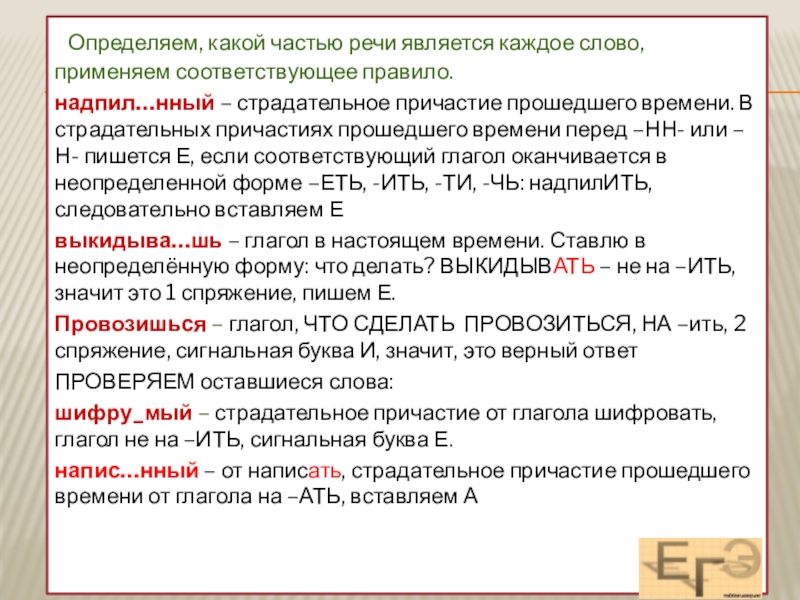 Слайд 19 Определяем, какой частью речи является каждое слово, применяем соответствующее правило.
