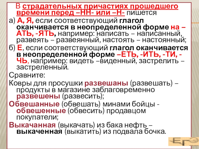 а) А, Я, если соответствующий глагол оканчивается в неопределенной форме на –АТЬ, -ЯТЬ, например: написать – написанный, развеять – развеянный, настоять – настоянный;