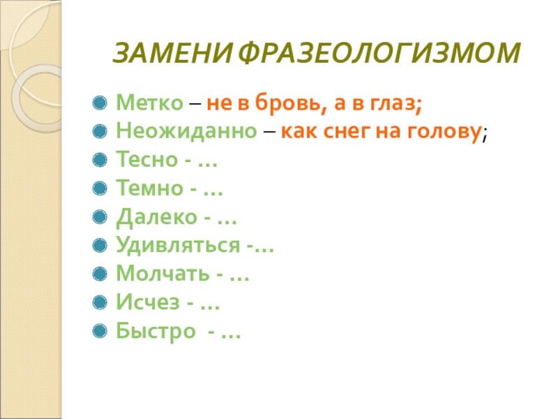 Слайд 6ЗАМЕНИ ФРАЗЕОЛОГИЗМОМ