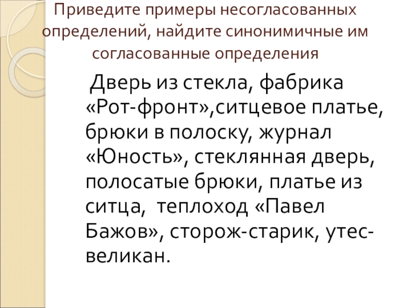 Слайд 35Приведите примеры несогласованных определений, найдите синонимичные им согласованные определения
