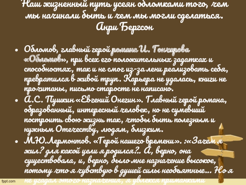 М.Ю.Лермонтов. «Герой нашего времени». :«Зачем я жил? для какой цели я родился?.. А, верно, она существовала, и, верно, было мне назначение высокое, потому что я чувствую в душей силы необъятные... Но я не угадал этого назначения, я увлекся приманками страстей пустых и неблагодарных»