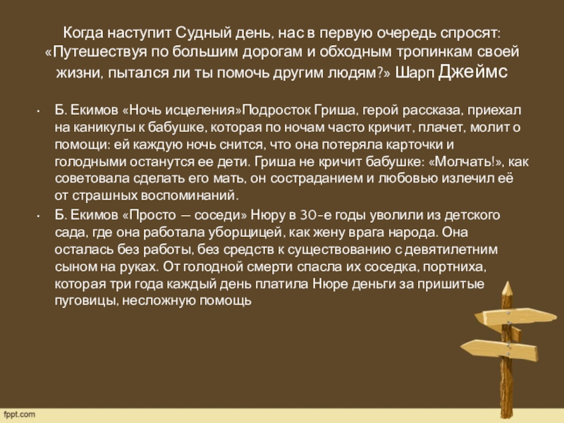 большим дорогам и обходным тропинкам своей жизни, пытался ли ты помочь другим людям?» Шарп Джеймс