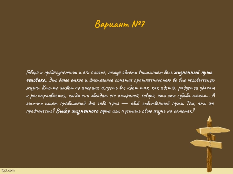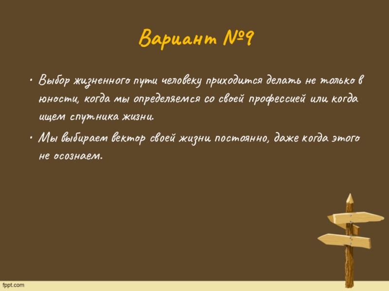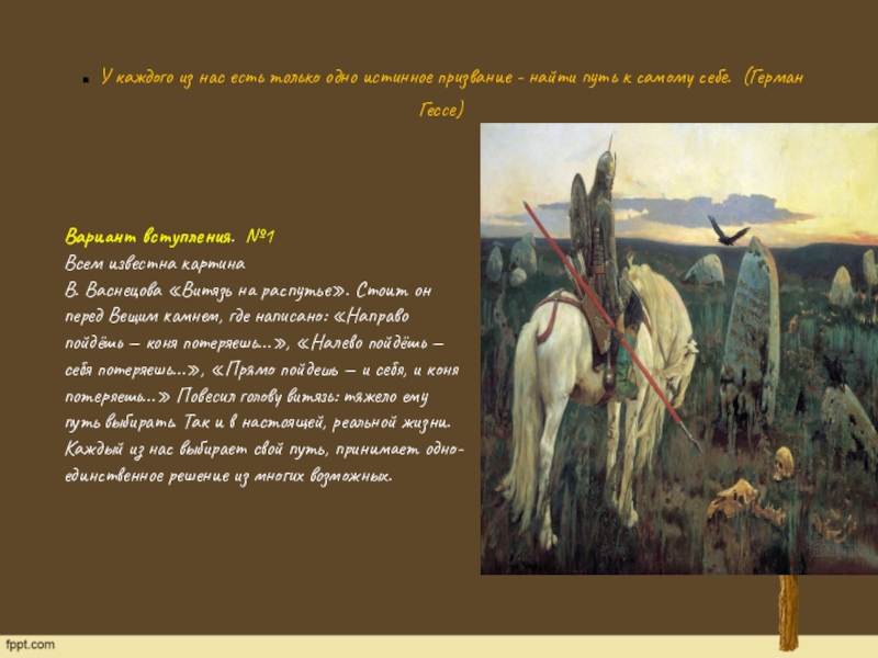 В. Васнецова «Витязь на распутье». Стоит он перед Вещим камнем, где написано: «Направо пойдёшь — коня потеряешь…», «Налево пойдёшь — себя потеряешь…», «Прямо пойдешь — и себя, и коня потеряешь…» Повесил голову витязь: тяжело ему путь выбирать. Так и в настоящей, реальной жизни. Каждый из нас выбирает свой путь, принимает одно-единственное решение из многих возможных.