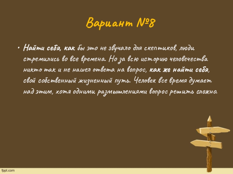во все времена. Но за всю историю человечества никто так и не нашел ответа на вопрос, как же найти себя, свой собственный жизненный путь. Человек все время думает над этим, хотя одними размышлениями вопрос решить сложно.
