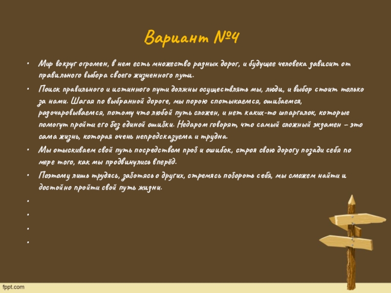 Поиск правильного и истинного пути должны осуществлять мы, люди, и выбор стоит только за нами. Шагая по выбранной дороге, мы порою спотыкаемся, ошибаемся, разочаровываемся, потому что любой путь сложен, и нет каких-то шпаргалок, которые помогут пройти его без единой ошибки. Недаром говорят, что самый сложный экзамен – это сама жизнь, которая очень непредсказуема и трудна.