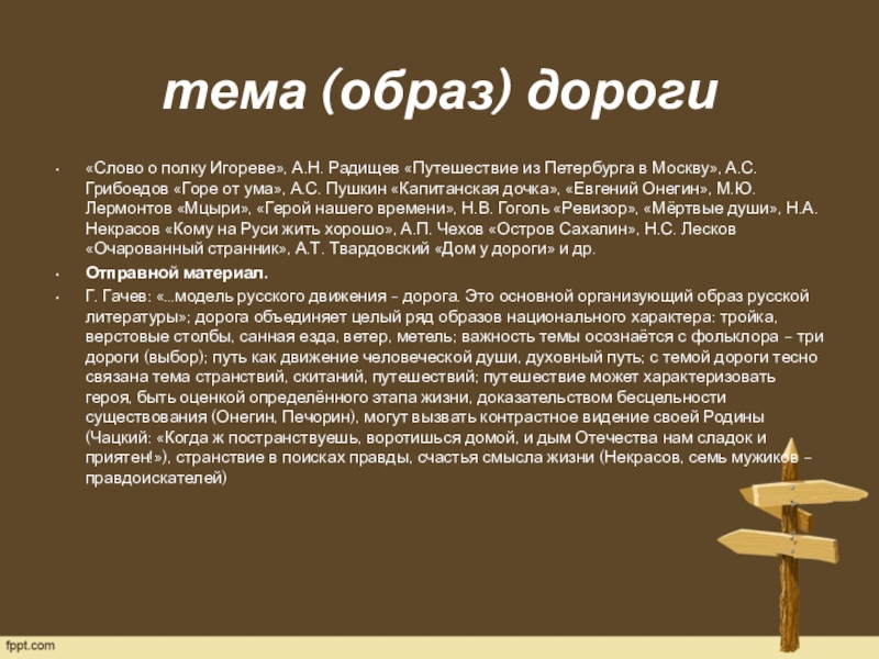 Г. Гачев: «…модель русского движения - дорога. Это основной организующий образ русской литературы»; дорога объединяет целый ряд образов национального характера: тройка, верстовые столбы, санная езда, ветер, метель; важность темы осознаётся с фольклора – три дороги (выбор); путь как движение человеческой души, духовный путь; с темой дороги тесно связана тема странствий, скитаний, путешествий; путешествие может характеризовать героя, быть оценкой определённого этапа жизни, доказательством бесцельности существования (Онегин, Печорин), могут вызвать контрастное видение своей Родины(Чацкий: «Когда ж постранствуешь, воротишься домой, и дым Отечества нам сладок и приятен!»), странствие в поисках правды, счастья смысла жизни (Некрасов, семь мужиков – правдоискателей)