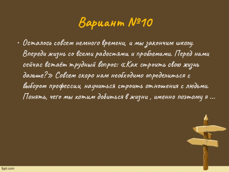со всеми радостями и проблемами. Перед нами сейчас встаёт трудный вопрос: «Как строить свою жизнь дальше?» Совсем скоро нам необходимо определиться с выбором профессии, научиться строить отношения с людьми. Понять, чего мы хотим добиться в жизни , именно поэтому я …
