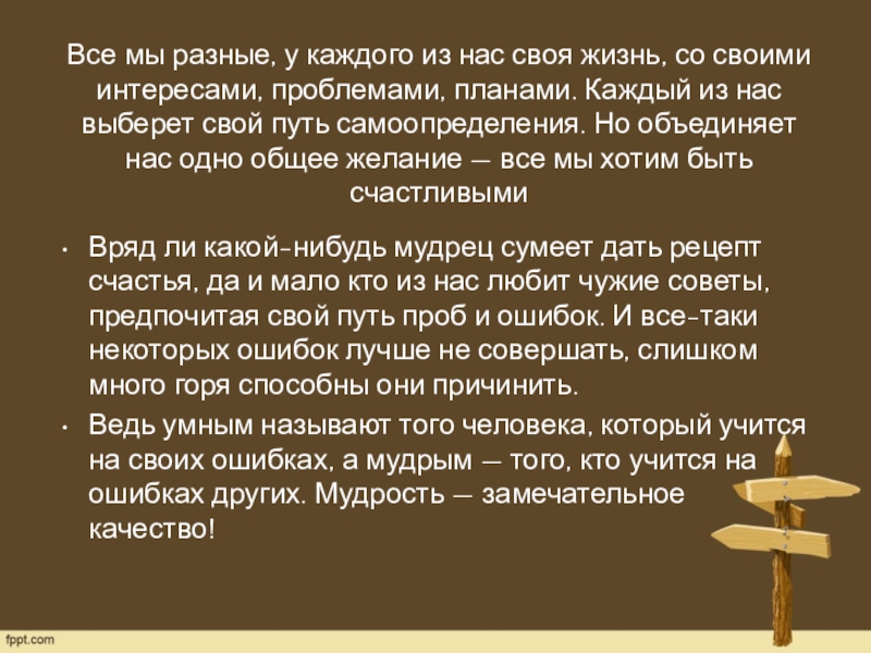 интересами, проблемами, планами. Каждый из нас выберет свой путь самоопределения. Но объединяет нас одно общее желание — все мы хотим быть счастливыми