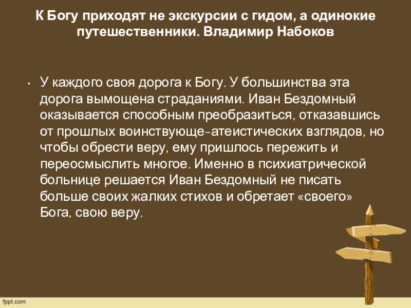 Слайд 23К Богу приходят не экскурсии с гидом, а одинокие путешественники. Владимир Набоков
