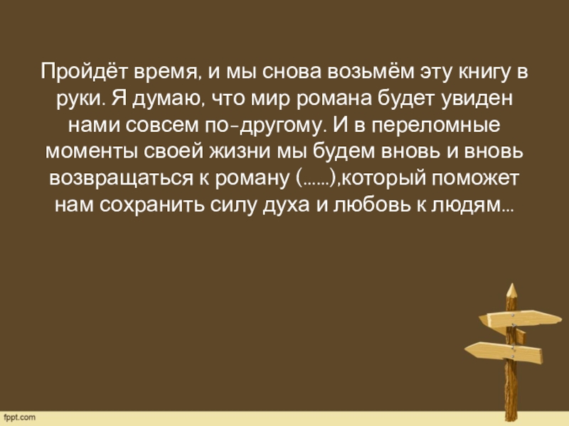 думаю, что мир романа будет увиден нами совсем по-другому. И в переломные моменты своей жизни мы будем вновь и вновь возвращаться к роману (……),который поможет нам сохранить силу духа и любовь к людям…