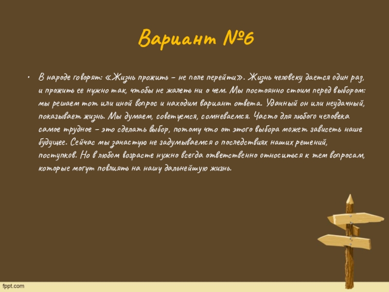 человеку дается один раз, и прожить ее нужно так, чтобы не жалеть ни о чем. Мы постоянно стоим перед выбором: мы решаем тот или иной вопрос и находим вариант ответа. Удачный он или неудачный, показывает жизнь. Мы думаем, советуемся, сомневаемся. Часто для любого человека самое трудное – это сделать выбор, потому что от этого выбора может зависеть наше будущее. Сейчас мы зачастую не задумываемся о последствиях наших решений, поступков. Но в любом возрасте нужно всегда ответственно относиться к тем вопросам, которые могут повлиять на нашу дальнейшую жизнь.