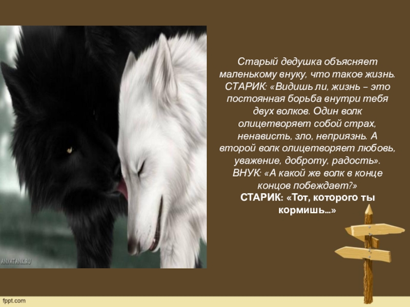 – это постоянная борьба внутри тебя двух волков. Один волк олицетворяет собой страх, ненависть, зло, неприязнь. А второй волк олицетворяет любовь, уважение, доброту, радость».