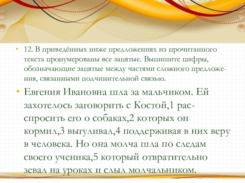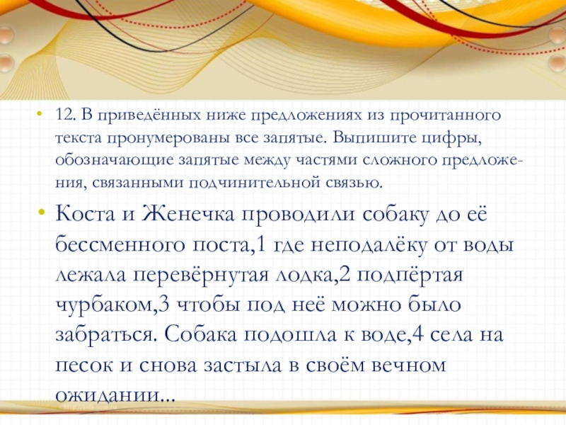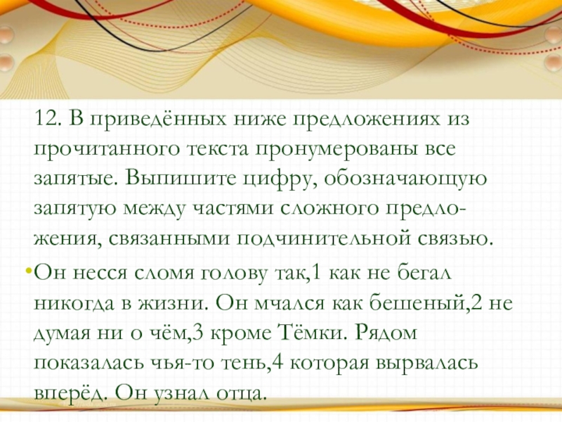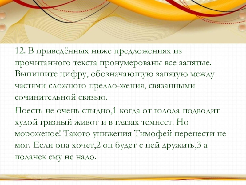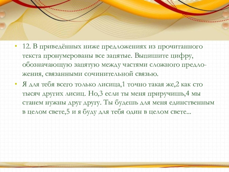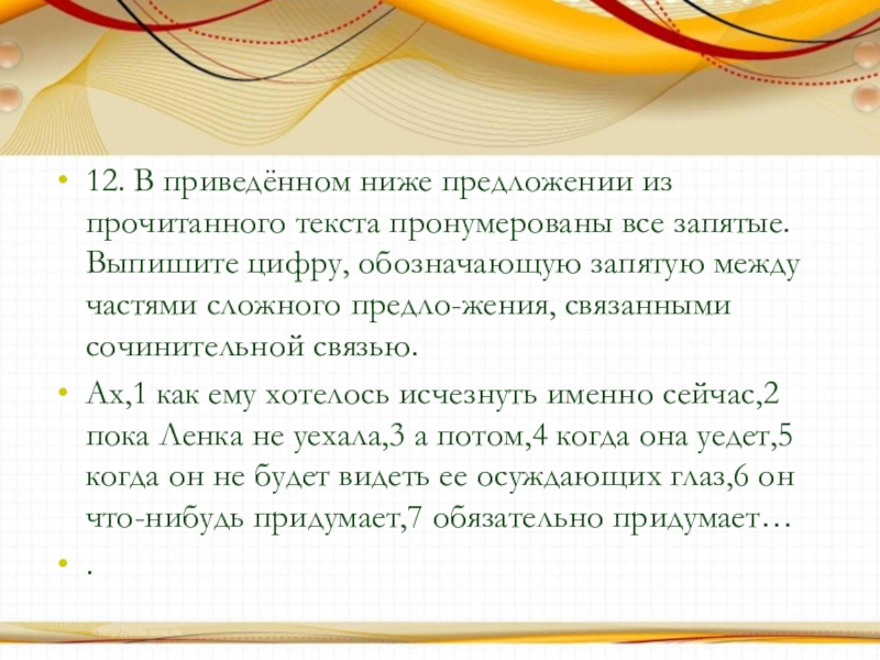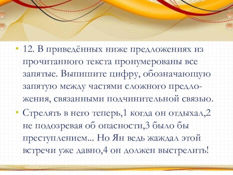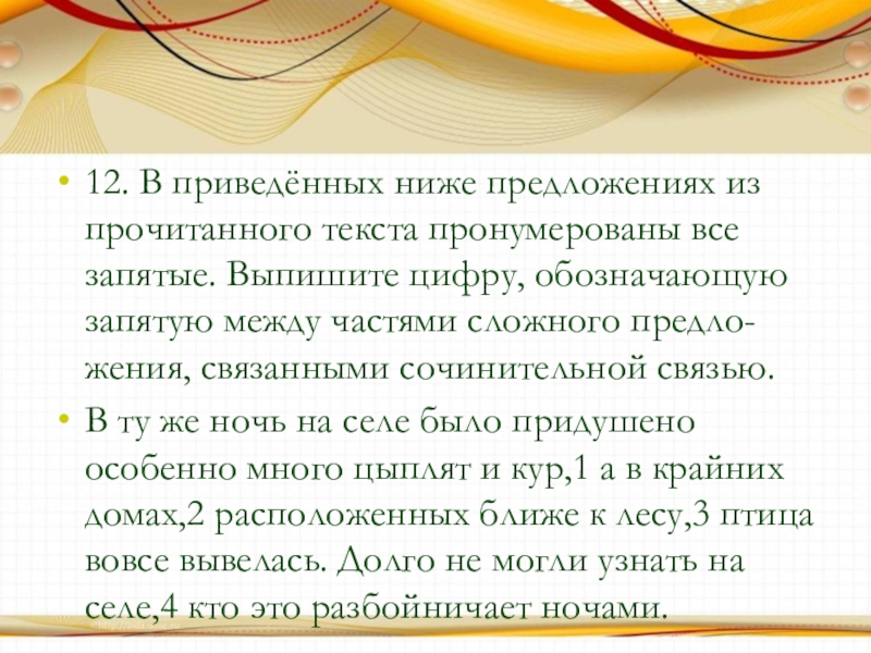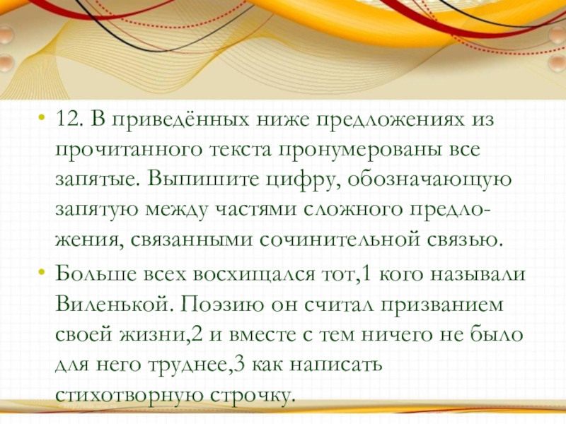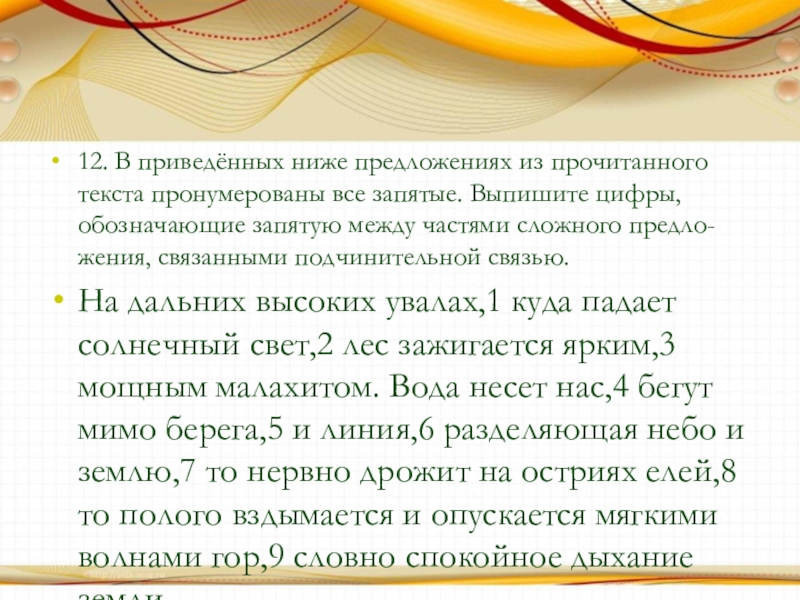 12. В приведённых ниже предложениях из прочитанного текста пронумерованы все запятые.