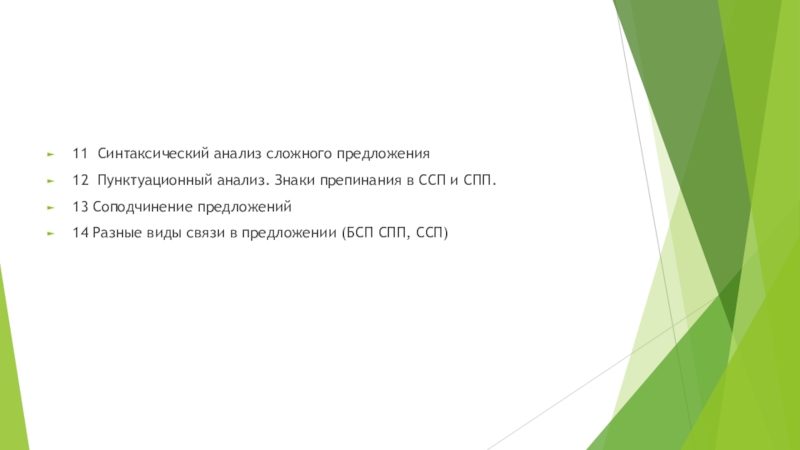 11  Синтаксический анализ сложного предложения12  Пунктуационный анализ. Знаки препинания в ССП и СПП.13 Соподчинение предложений14 Разные виды