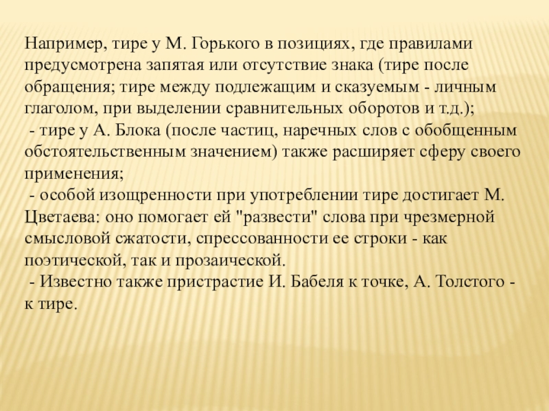 Слайд 23Например, тире у М. Горького в позициях, где правилами предусмотрена запятая