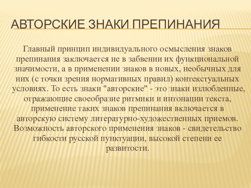 забвении их функциональной значимости, а в применении знаков в новых, необычных для них (с точки зрения нормативных правил) контекстуальных условиях. То есть знаки "авторские" - это знаки излюбленные, отражающие своеобразие ритмики и интонации текста, применение таких знаков препинания включается в авторскую систему литературно-художественных приемов. Возможность авторского применения знаков - свидетельство гибкости русской пунктуации, высокой степени ее развитости.