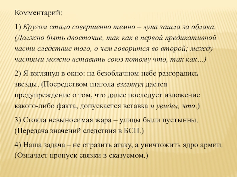 3) Стояла невыносимая жара – улицы были пустынны. (Передача значений следствия в БСП.)