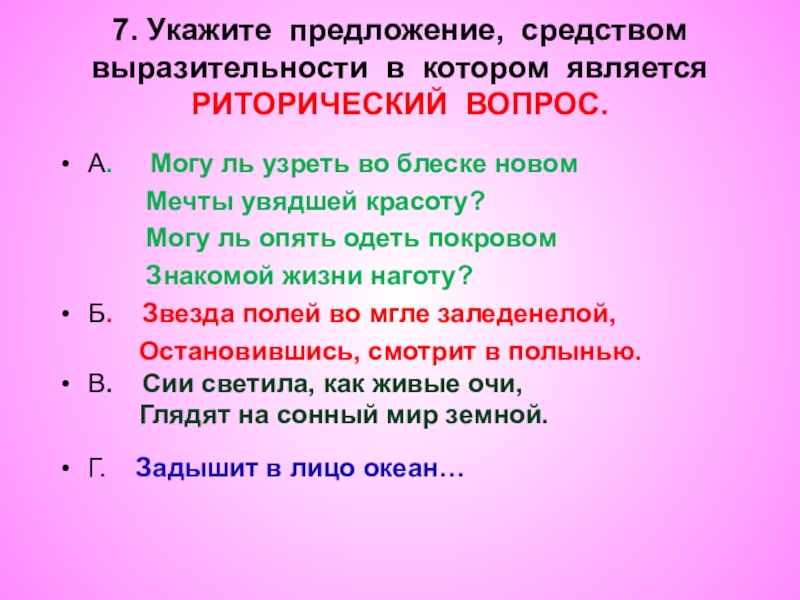 7. Укажите предложение, средством выразительности в котором является РИТОРИЧЕСКИЙ ВОПРОС.