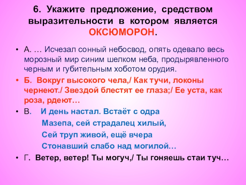 6. Укажите предложение, средством выразительности в котором является ОКСЮМОРОН.