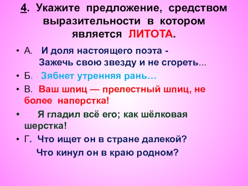 4. Укажите предложение, средством выразительности в котором является ЛИТОТА.