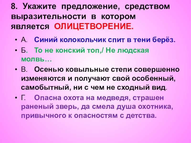 8. Укажите предложение, средством выразительности в котором является ОЛИЦЕТВОРЕНИЕ.