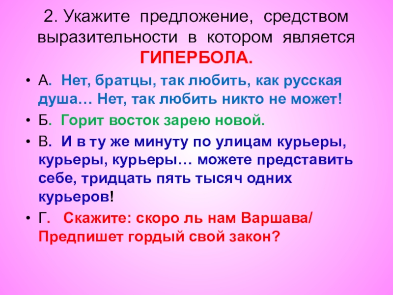 2. Укажите предложение, средством выразительности в котором является ГИПЕРБОЛА.