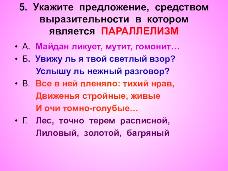 5. Укажите предложение, средством выразительности в котором является ПАРАЛЛЕЛИЗМ