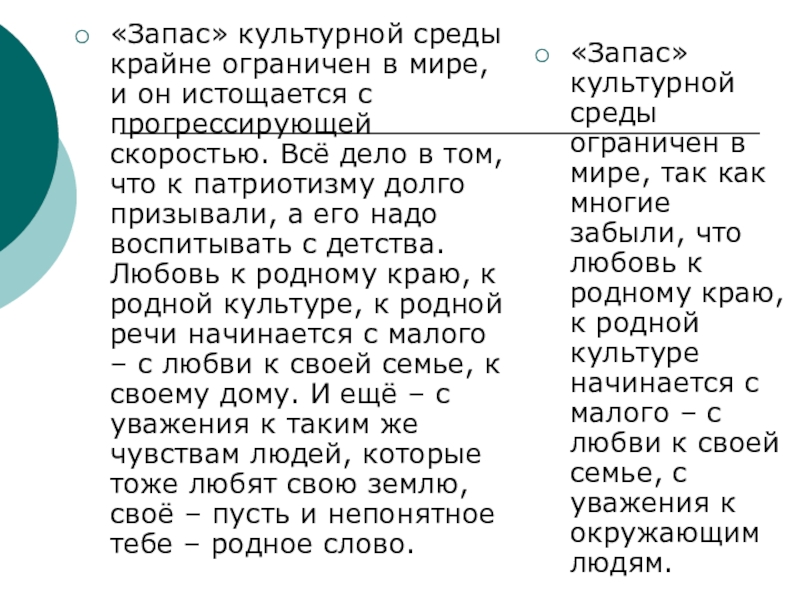 «Запас» культурной среды ограничен в мире, так как многие забыли, что любовь к родному краю, к родной культуре начинается с малого – с любви к своей семье, с уважения к окружающим людям.