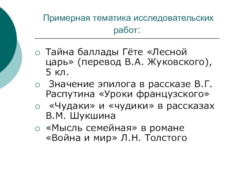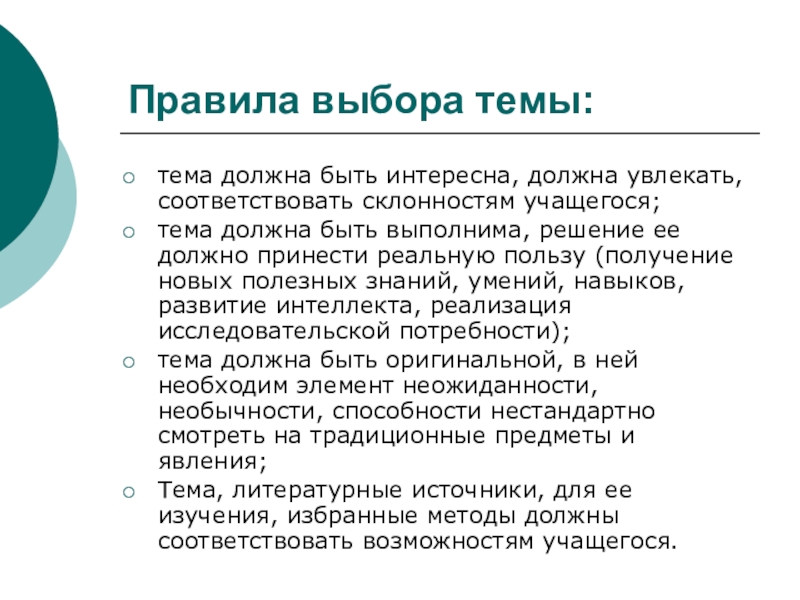 Тема, литературные источники, для ее изучения, избранные методы должны соответствовать возможностям учащегося.