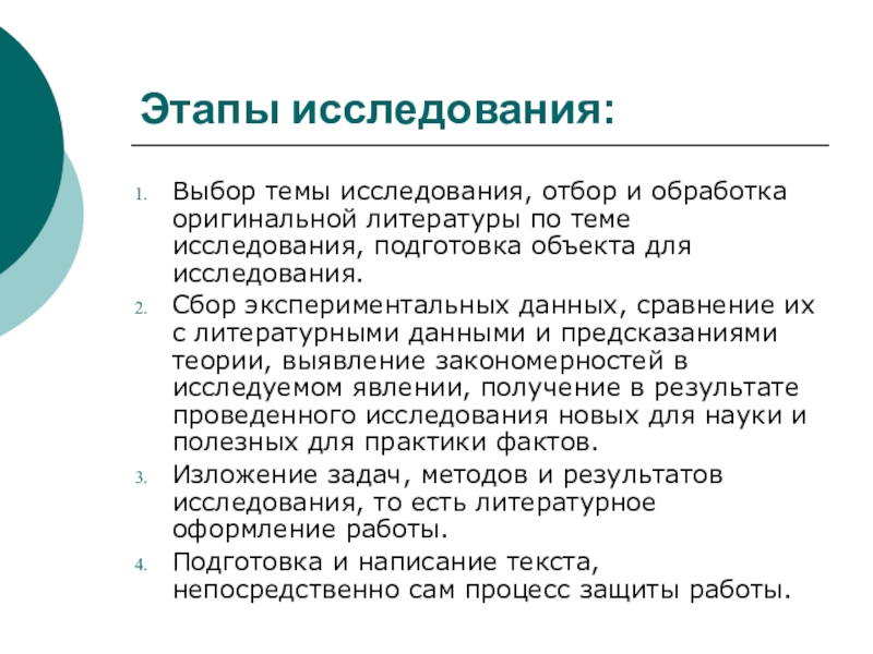 Сбор экспериментальных данных, сравнение их с литературными данными и предсказаниями теории, выявление закономерностей в исследуемом явлении, получение в результате проведенного исследования новых для науки и полезных для практики фактов.