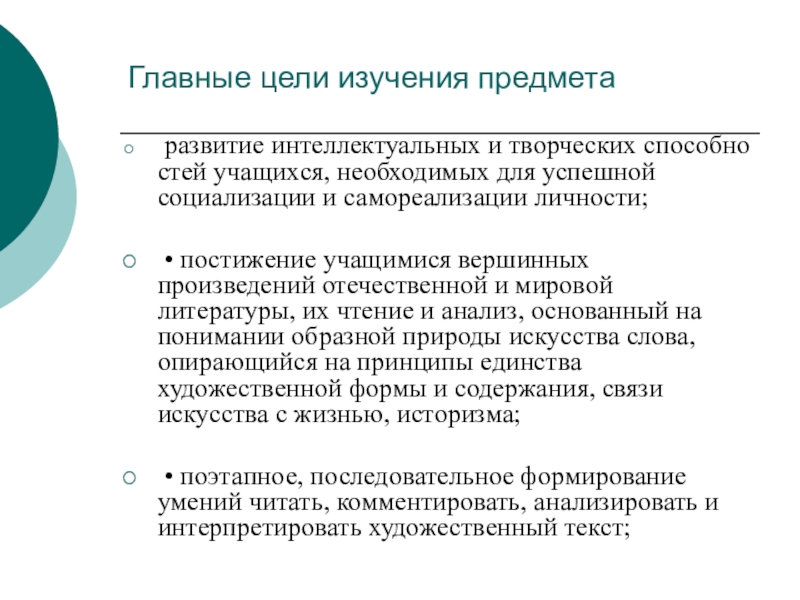 • постижение учащимися вершинных произведений отечественной и мировой литературы, их чтение и анализ, основанный на понимании образной природы искусства слова, опирающийся на принципы единства художественной формы и содержания, связи искусства с жизнью, историзма;