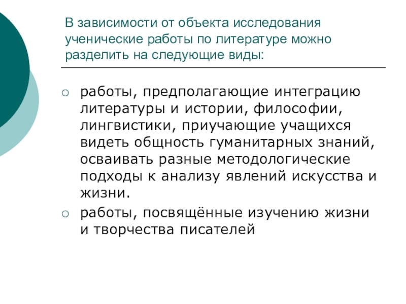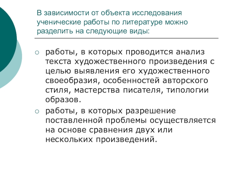 Слайд 15В зависимости от объекта исследования ученические работы по литературе можно разделить