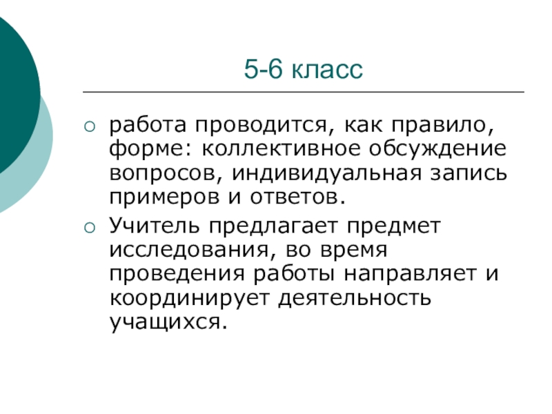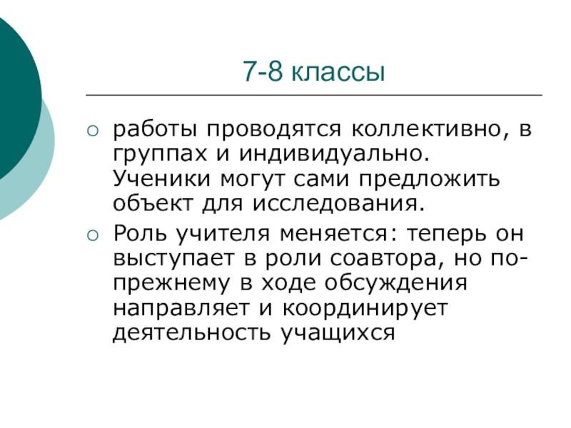 Учитель предлагает предмет исследования, во время проведения работы направляет и координирует деятельность учащихся.