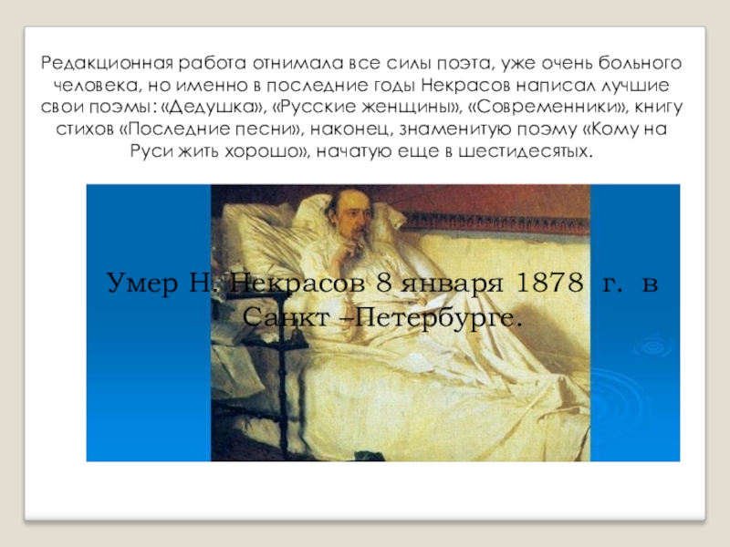 Умер Н. Некрасов 8 января 1878 г. в Санкт –Петербурге.