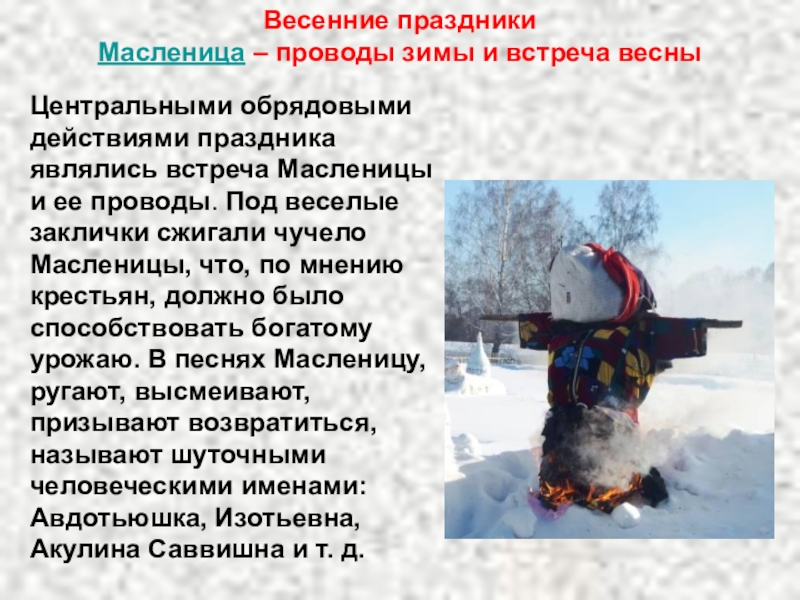 Слайд 10Центральными обрядовыми действиями праздника являлись встреча Масленицы и ее проводы. Под