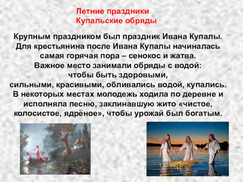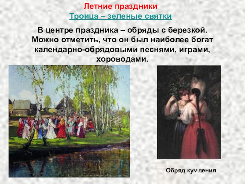 уборку последнего снопа в поле, молодежные гулянья и рождественские или троицкие обряды, крестины и свадьбы. Обрядовые песни считались такой же обязательной составной частью обряда, как и основные обрядовые действия.