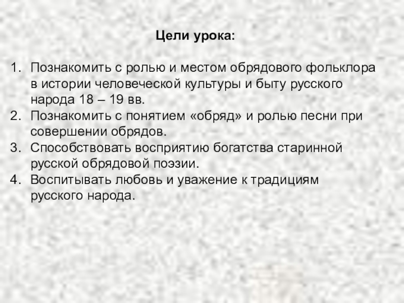 Познакомить с ролью и местом обрядового фольклора в истории человеческой