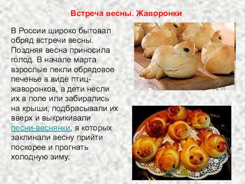 приносила голод. В начале марта взрослые пекли обрядовое печенье в виде птиц-жаворонков, а дети несли их в поле или забирались на крыши, подбрасывали их вверх и выкрикивали песни-веснянки, в которых заклинали весну прийти поскорее и прогнать холодную зиму.